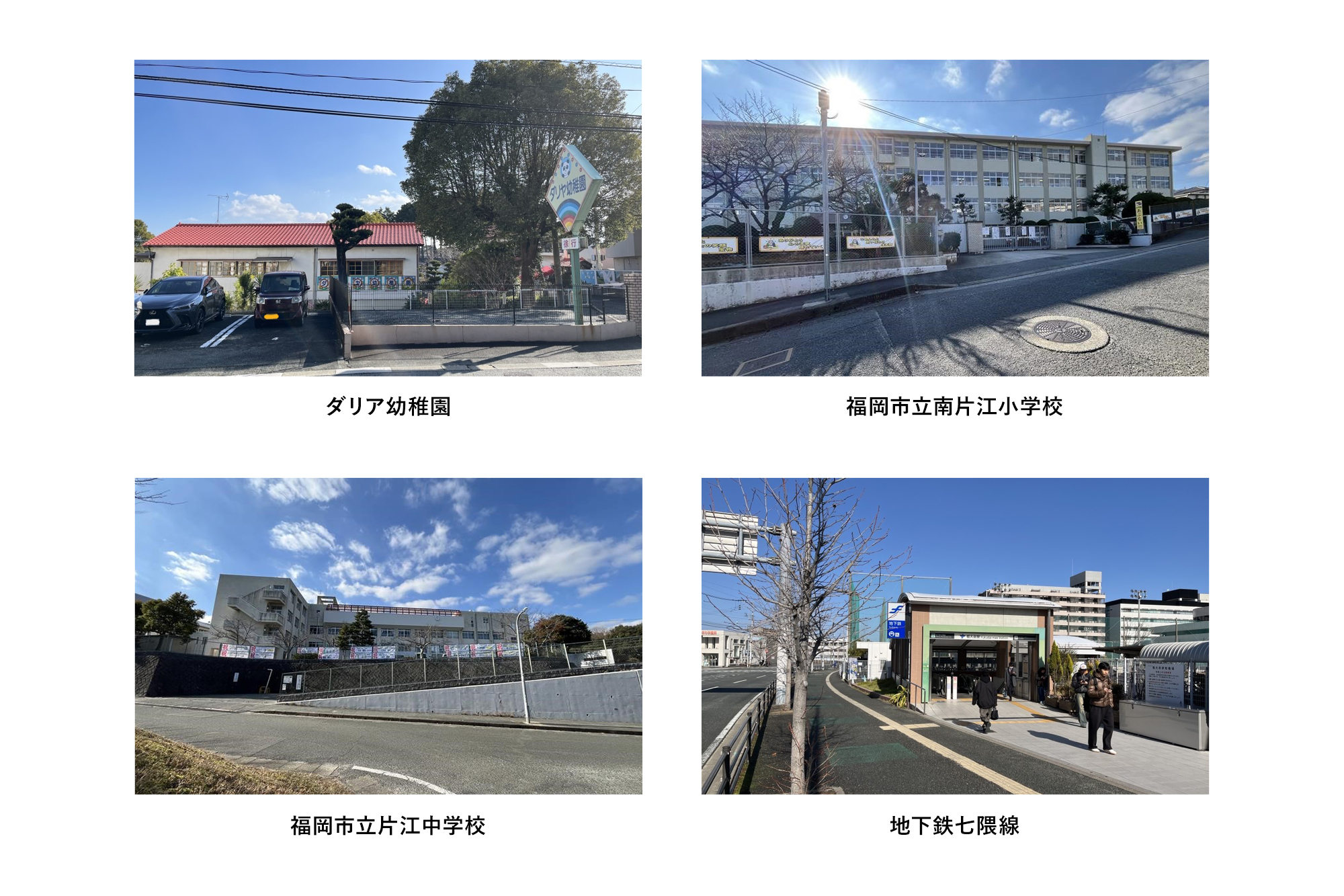 南片江小学校まで約800m~900m(徒歩約10分~12分)、 片江中学校まで約90~190m(徒歩約2分~3分)、 ダリア幼稚園まで約1300~1350m(徒歩約17分) 慈光幼稚園まで約1300m~1350m(徒歩約17分)