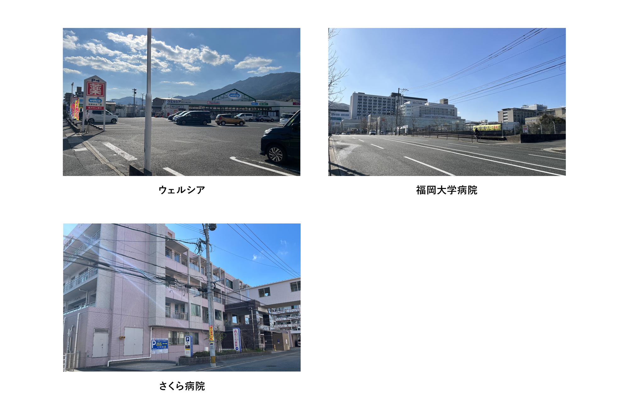 さくら病院まで約600m~650m(徒歩約8分~9分)、福岡大学病院まで約1,950m~2,000m(車で約3分)