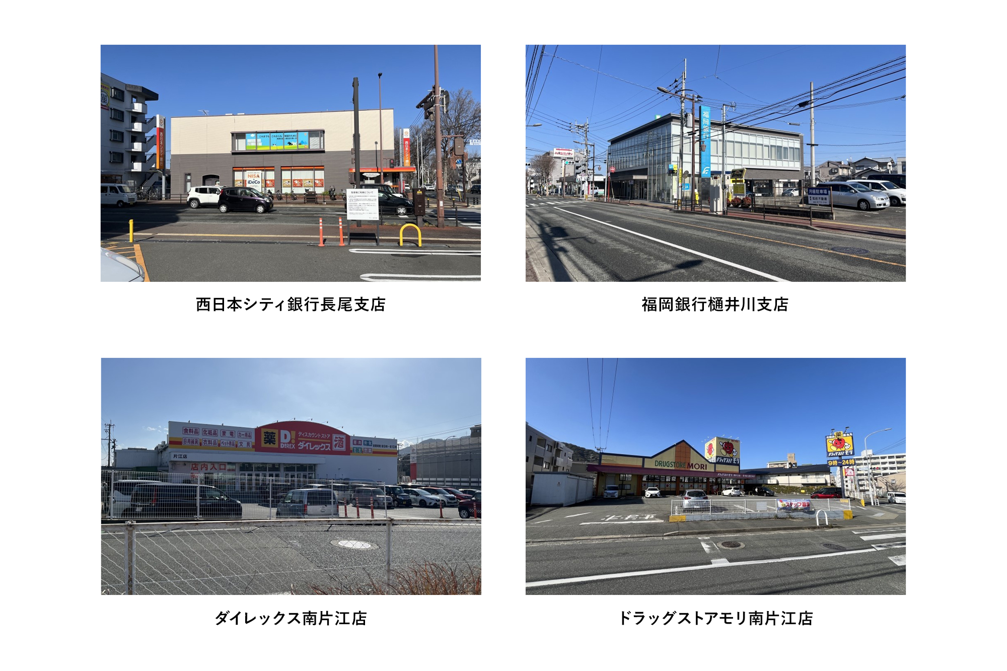福岡銀行樋井川支店まで約2,450m~2,500m(車で約4分)、西日本シティ銀行長尾支店まで約2,100m~2,150m(車で約4分)